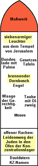 Im unteren Teil des Fensters sind Menschen unter dem Davidstern in einem großen Maul mit Reisszähnen zu sehen umgeben von Feuer, darunter die Namen der Konzentrationslager Treblinka, Auschwitz und Bergen-Belsen.