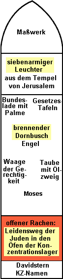 Vor dem Höllendrachen steht eine nackte, verängstigte Menschengruppe. Der Davidstern als Symbol des Judentums weist sie als die Häftlinge der Konzentrationslager aus. Im Maul des Höllendrachens lodern die Verbrennungsöfen der KZs. Dies ist wohl die erschütternste Szene des Israelfensters. |